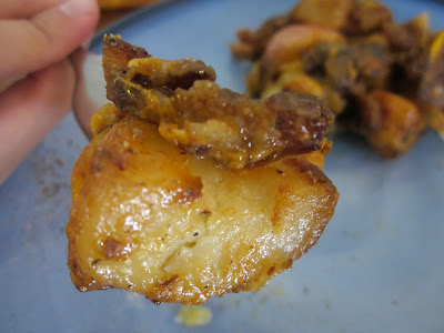 When the onions are done to your liking, add the potatoes. Stir occasionally, let them gain some crispy brown edges. (See the garlic clove? I left those in too. YUM!)